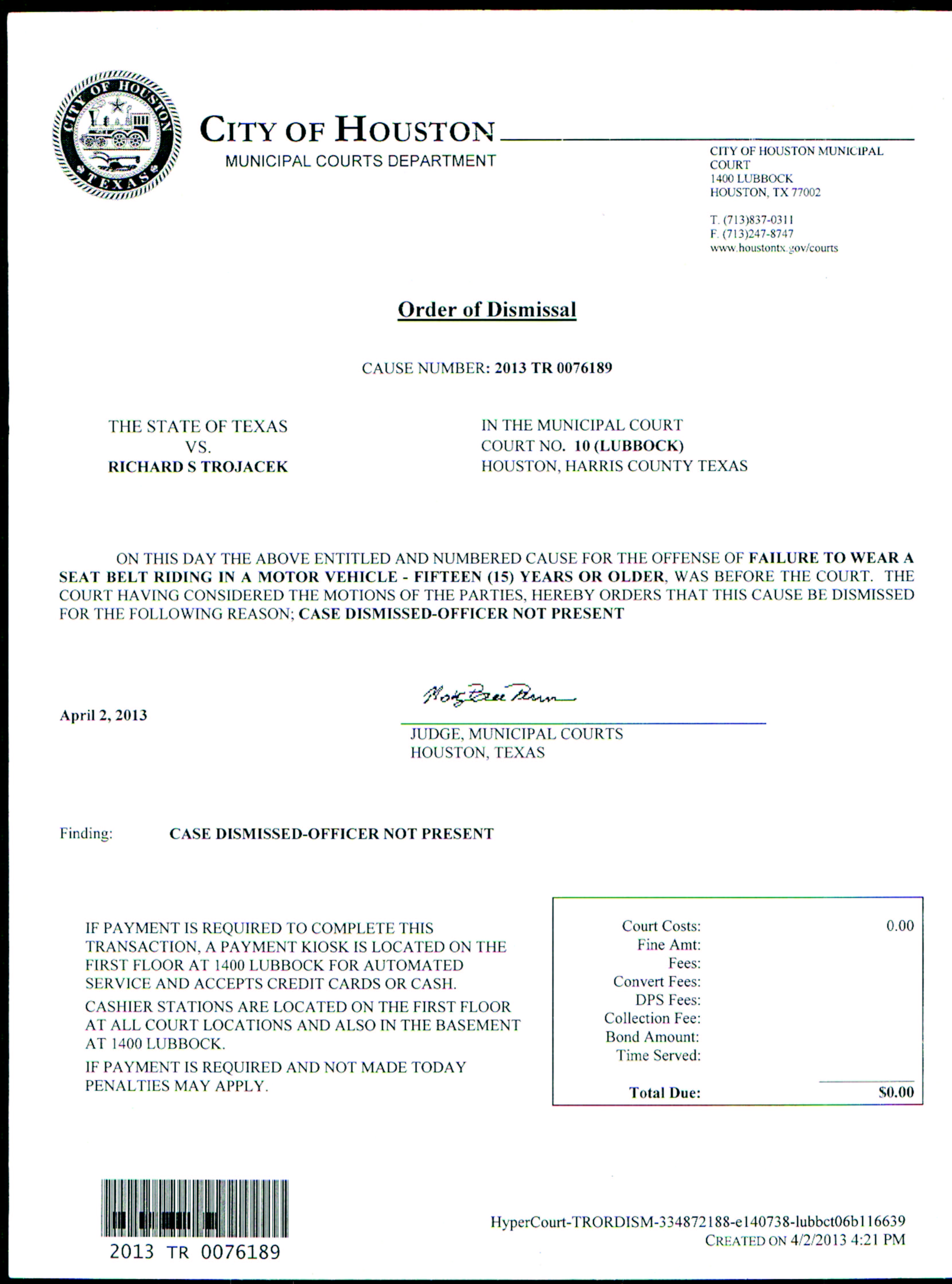 PLEASE TAKE NOTICE, that on the within affidavit of RICHARD TROJACEK, affirmed and witnessed to on the ___ day of ___, 2013, and upon all the proceedings heretofore had herein, the undersigned Motion and Supporting Affidavit to Dismiss will move this court at the courthouse located at the Municipal Courthouse #16, Houston, Texas $$$$, on the 19th day of March, 2013, at 7:00 o’clock in the evening of that day or as soon thereafter as can be heard for an Order of Dismissal of the within Summons of No Seat Belts.
